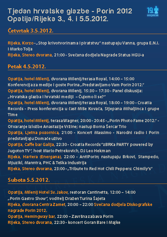 Devetnaesta dodjela Diskografske nagrade Porin središnji je glazbeni događaj sljedećeg tjedna. Zbog bogate ponude zbivanja u gradovima domaćinima, Opatiji i Rijeci, ti su dani prozvani Tjednom hrvatske glazbe. 19. Porin je medijski svakako najzanimljiviji ali uz njega će se zbivati i druge važne i zabavne stvari vezane za glazbenu i medijsku industriju.